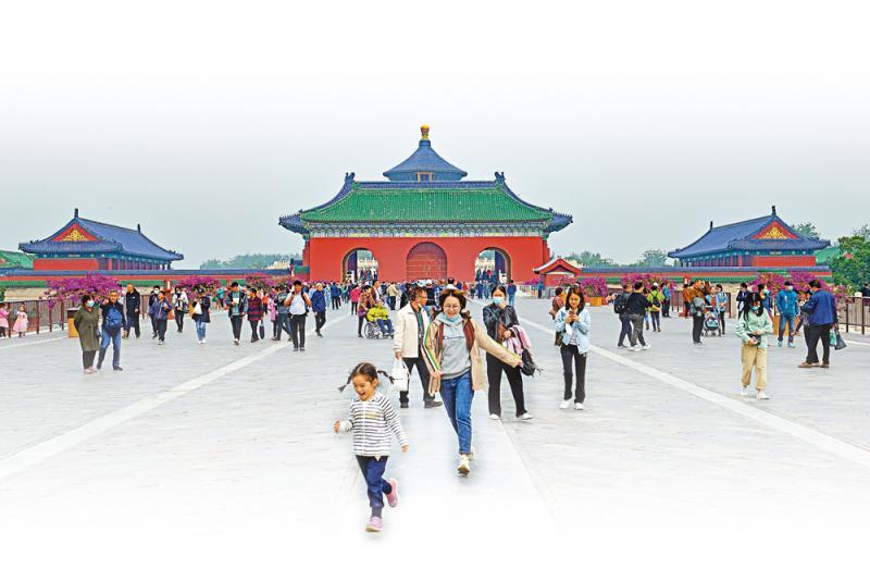 圖:據文旅部統計,國慶8天長假全國共接待國內遊客6.37億人次。圖為遊客8日在北京天壇公園遊玩\\中新社...