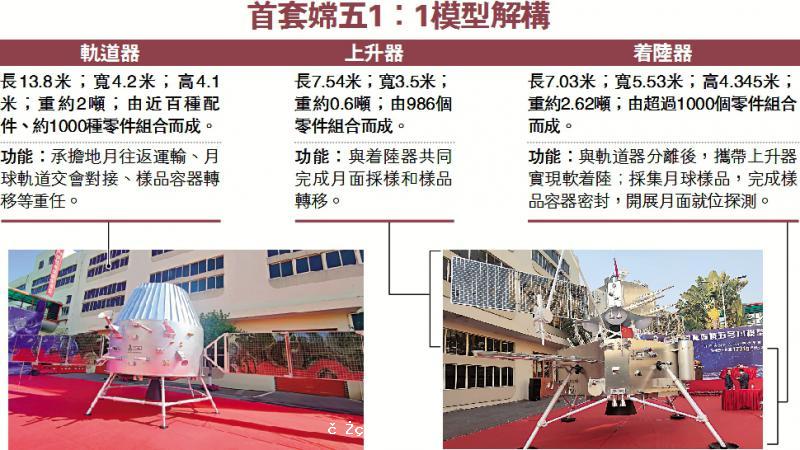 長13.8米;寬4.2米;高4.1米;重約2噸;由近百種配件、約1000種零件組合而成。 功能:承擔地月往返運輸、月球軌道交會對接、樣品容器轉移等重任。 ...