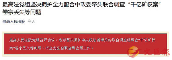■「最高人民法院」微信公號截圖。據中國長安網消息,針對網上反映最高人民法院二審審理的陝西榆林凱奇萊能源投資有限公司訴西安地質礦產勘查開發院合作勘查合同糾紛案卷宗丟失等問題,近日,由中央政法委牽頭,中央[详细]