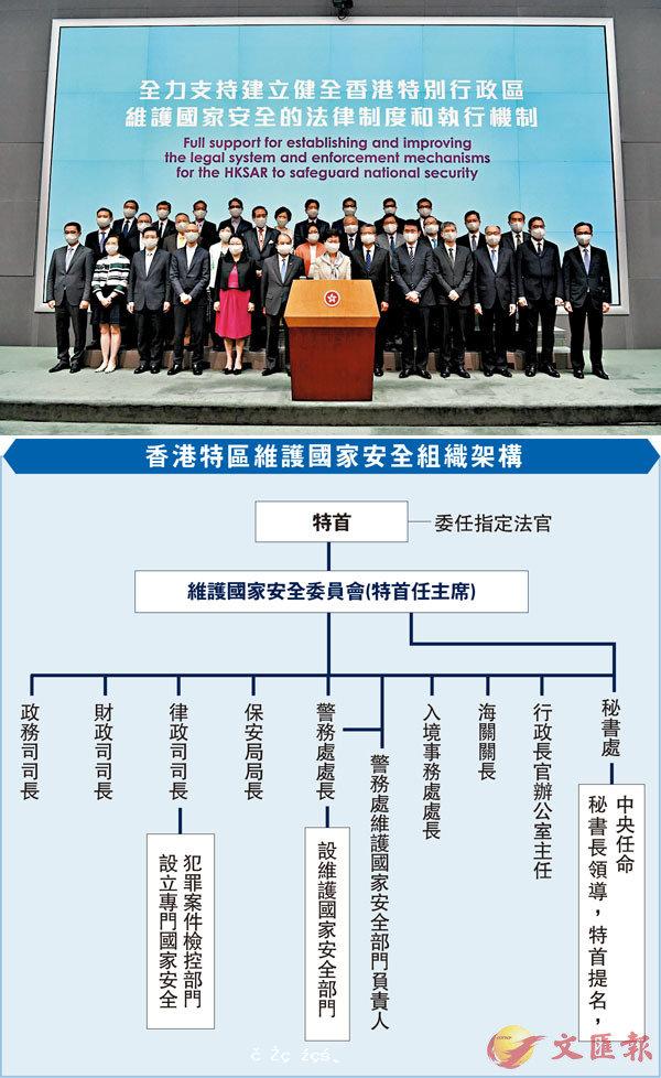 ■ 草案說明顯示出由香港特區負責主體工作,反映中央在很大程度上信任及倚重香港特區。圖為特首率領司局長、行政會議成員,支持全國人大審議有關建立健全香港維護國家安全的法律制度和執行機制的決定。 資料圖片[详细]