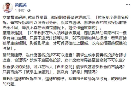 縱暴派組織香港教育專業人員協會(教協)副會長葉建源妄稱香港教育局處理匿名投訴是「過度指控」。全國政協副主席、前任香港特首梁振英在社交媒體上反問,為什麼匿名投訴不可以追查?要學生或家長實名投訴老師才追查,合理嗎? [详细]