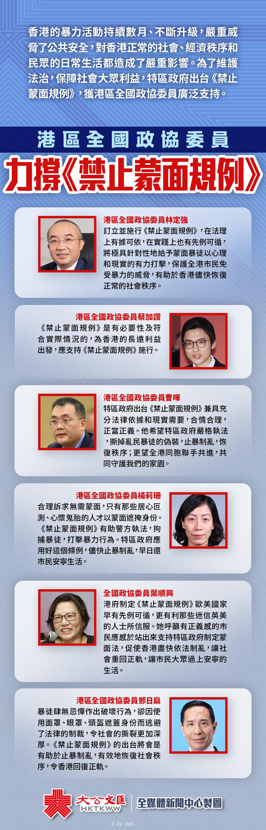 香港的暴力活動持續數月、不斷升級,嚴重威脅了公共安全,對香港正常的社會、經濟秩序和民眾的日常生活都造成了嚴重影響。為了維護法治,保障社會大眾利益,特區政府出台《禁止蒙面規例》,獲港區全國政協委員廣泛支持。 [详细]