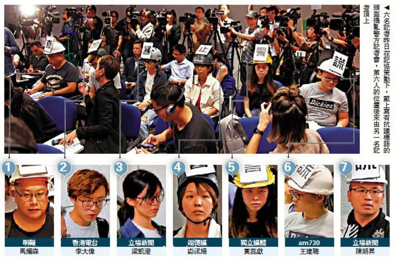 「黃媒」「黑記」再度搗亂警方記者會。在記協策動下,六名記者昨日戴上寫有抗議標語的頭盔出席警方記者會,警方要求六人離場不果,被迫首度宣布取消例行記者會,改網上直播。這是繼上周一記協會員葉家文強闖記者會導致記招暫停後,警方記...[详细]