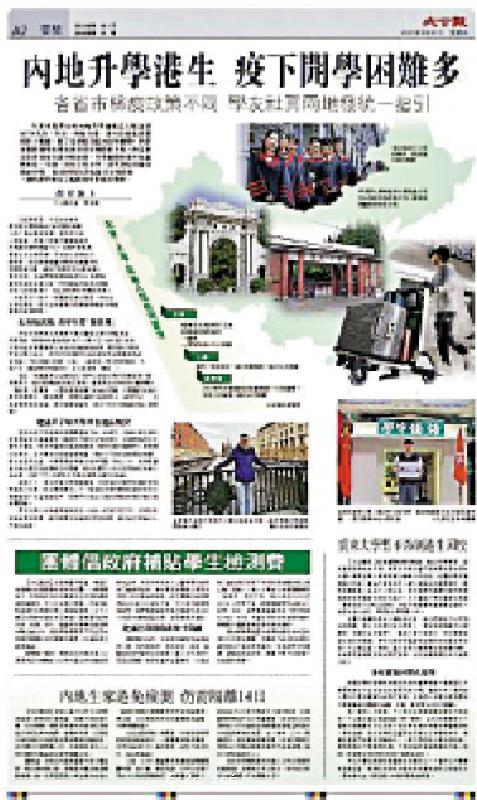 內地大學九月份陸續開學,《大公報》早前曾報道內地升學港生在疫情下遇到各種困難,包括檢測與隔離費用高昂等,據報有港生選擇轉道澳門再前往內地,有的港生須在不同省市隔離兩次,行程曲折。民建聯立法會議員張國鈞認為,香港教育局應...[详细]