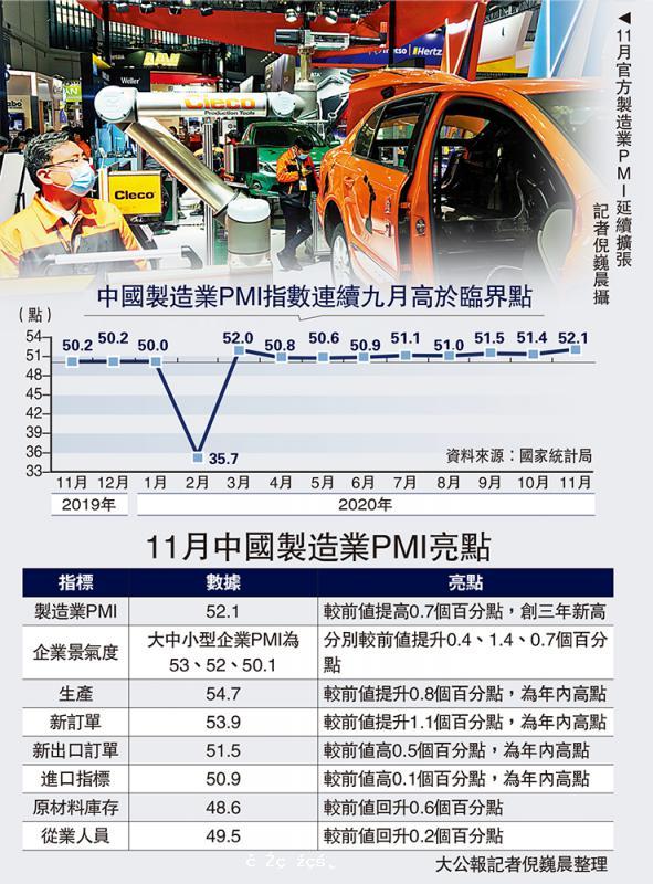 中國經濟穩步復甦,11月製造業採購經理指數(PMI)創逾3年新高。國家統計局昨日發布數據顯示,11月中國製造業PMI報52.1,較前值提升0.7個百分點,連續9個月穩定在榮枯線上方。國家統計局服務業調查中心高級統計師趙慶河介紹,受調查的21個...[详细]