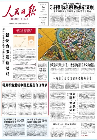人民日報評論員:利用香港遏制中國發展是白日做夢