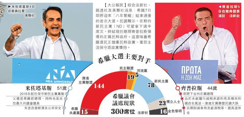 綜合法新社、路透社及美聯社消息:希臘7日即將迎來「八年緊縮」結束過後的首次大選。民調顯示,在野的新民主黨(ND)可望拿下過半席次,終結現任總理齊普拉斯領導的左翼民粹政府。這意味着希臘選民正拋棄民粹政黨、重回主流保守派政黨懷...[详细]