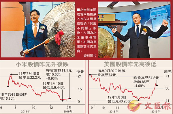 趁好消息沽貨 兩股反高潮 惟後市仍看好獲不少基金追蹤的MSCI指數昨公佈季度指數成分股檢討結果,其中,兩隻「同股不同權」股份-小米(1810)與美團點評(3690)首次獲納入MSCI明晟指數,在本月底收市後生效。分析員認[详细]
