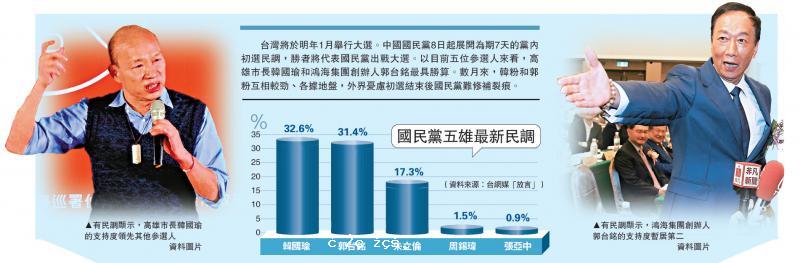 台灣將於明年1月舉行大選。中國國民黨8日起展開為期7天的黨內初選民調,勝者將代表國民黨出戰大選。以目前五位參選人來看,高雄市長韓國瑜和鴻海集團創辦人郭台銘最具勝算。數月來,韓粉和郭粉互相較勁、各據地盤,外界憂慮初選結束後國民...[详细]