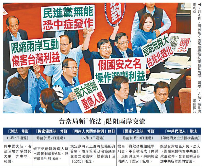 蔡英文5日在臉書宣稱,台「立法院」下個會期將完成對所謂「中共代理人」的「修法」。由於所有法人、團體都列入規範,且涉危害「國安」定義不清,等同民間交流也全列管,也引來全面關閉民間交流的質疑。中國國民黨初選候選人朱立倫直斥,蔡...[详细]