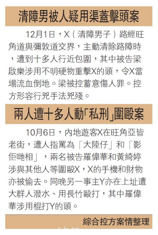 暴徒動用私刑成癮,手法兇殘!其中兩案共三名被告昨被押解到西九龍法院提堂,署理總裁判官羅德泉直指案情嚴重,不准各被告保釋,還押至3月12日再訊,等候警方進一步調查。 [详细]