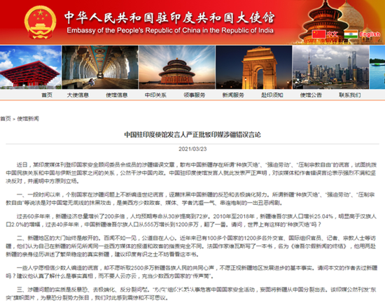 近日,某印度媒體刊登印國家安全顧問委員會成員的涉疆錯誤文章,散布中國新疆存在所謂「種族滅絕」、「強迫勞動」、「壓制宗教自由」的謊言,試圖挑撥中國民族關係和中國與伊斯蘭國家之間的關係,公然干涉中國內政。中國駐印度使館發言人...[详细]
