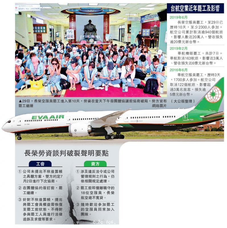 台灣長榮航空勞資雙方就空服員各項要求協商多次破局,終釀罷工。勞資雙方在罷工後仍未能協商對話,長榮航空21日更表示,工會提出的勞工董事訴求不符合法律規定,已於當天下午提出「非法罷工告訴」,要求工會每天賠償3400萬元新台幣。這...[详细]