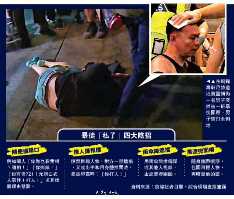 「十.一」前夕,暴陡變本加厲,暴力持續升級,昨日再有多名市民和遊客被暴徒圍毆「私了」,倒地後繼續被打,暴徒打完再用黑漆噴面羞辱被「私了」者。其中一名被「私了」男子只是路過,卻被暴徒指斥「福建人,抵死!」其間有人高叫「打死...[详细]