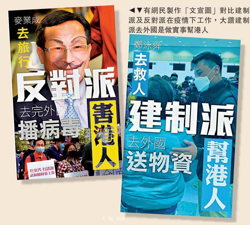 在新冠疫情肆虐下,全港市民生活大受影響,有網民製作「文宣圖」將建制派及反對派在今次疫情下的工作做對比,指建制派去外國是做實事幫港人,如民建聯議員鄭泳舜到外國送物資,相反反對派去外國回港後播病毒害港人,將外地的病毒帶回香港...[详细]
