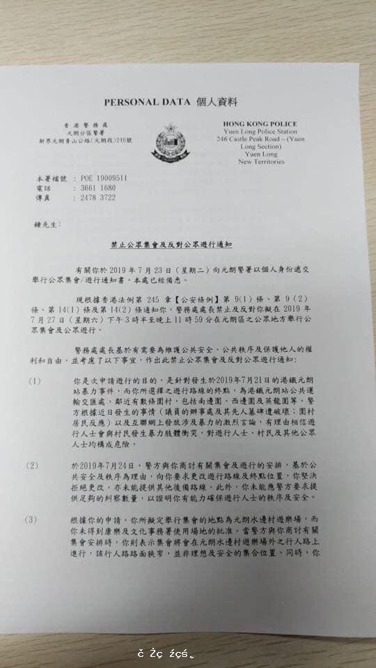 周六元朗遊行 警方發反對通知書