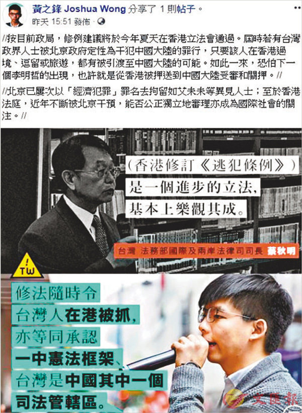 ■黃之鋒聲言修例會令台灣人在香港過境都會被「引渡」。 資料圖片香港文匯報訊(記者鄭治祖)為反對保安局修訂《逃犯條例》,反對派不停「靠嚇」,除了在港聲稱修例會「送香港人去『大陸』受審」,更跑到台灣散播恐慌[详细]