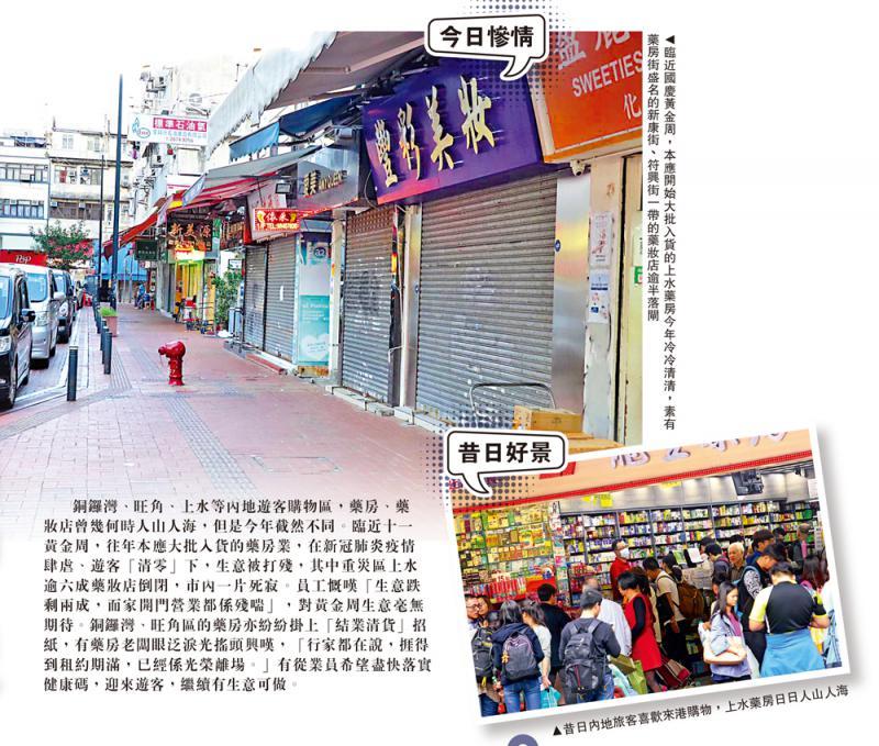 銅鑼灣、旺角、上水等內地遊客購物區,藥房、藥妝店曾幾何時人山人海,但是今年截然不同。臨近十一黃金周,往年本應大批入貨的藥房業,在新冠肺炎疫情肆虐、遊客「清零」下,生意被打殘,其中重災區上水逾六成藥妝店倒閉,市內一片死寂。...[详细]
