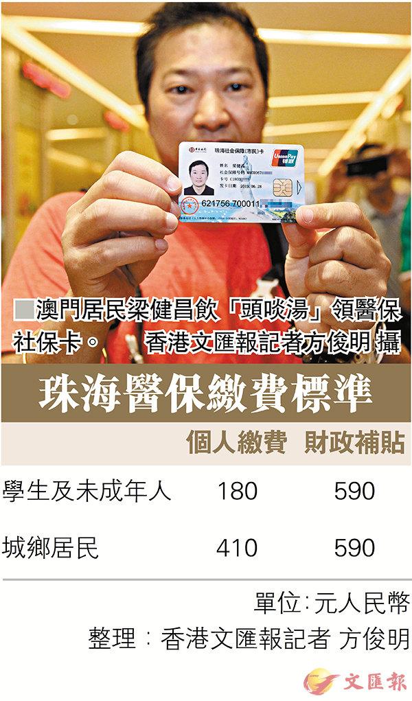 粵港澳大灣區跨境參加醫療保險取得新突破。昨日,首批澳門居民在珠海橫琴自貿區領取了「澳門居民參加珠海醫保社會保障卡」。橫琴新區黨委副書記李偉輝表示,該舉措是對國家支持在內地居住港澳台居民依法參加社會保險[详细]