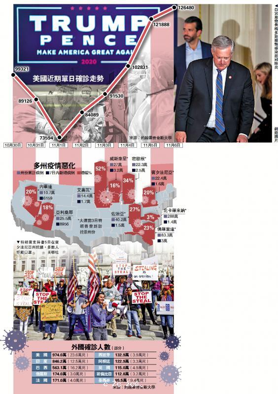 綜合《華盛頓郵報》、彭博社、CNN報道:美國大選點票持續之時,新冠疫情也進一步惡化。根據約翰霍普金斯大學統計,美國6日單日新增逾12.6萬宗確診病例再破紀錄,累計確診數直逼一千萬大關,白宮幕僚長梅多斯亦確診。勝券在握的民主黨候...[详细]