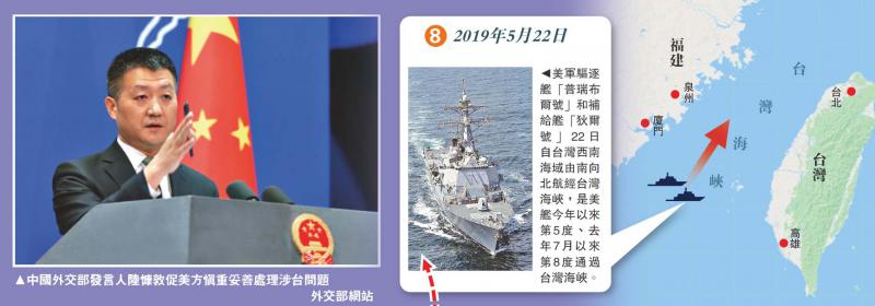 美艦八闖台海 中方促恪守一中中國外交部發言人陸慷敦促美方慎重妥善處理涉台問題 外交部網站美軍兩艘作戰艦22日自台灣西南海域由南向北航經台灣海峽。這也是今年以來美艦第5度、去年7月以來第8度穿越台灣海峽。中國外交部發言人陸慷23日在記者會[详细] 2019-05-23 00:00 分类:即 時