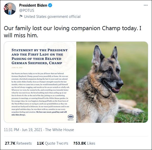 美國當地時間19日,美國總統拜登宣布他的愛犬「冠軍」(Champ)去世。中國台灣地區領導人蔡英文昨日(20日)下午在拜登推文下留言哀悼,遭網友炮轟其無視因疫情去世和接種疫苗後猝死的台灣民眾,卻跑去哀悼美國總統的狗。[详细]