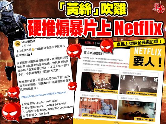 美化「黑暴」電影《理大圍城》在輿論炮轟下煞停上映,有「黃絲」因停映而呱呱嘈,千方百計搵機會突圍搞事,近日在社交平台「吹雞」發起合力推介運動,話要「知會」美國網絡電視Netflix採購部,希望他們能夠安排上架喎。[详细]