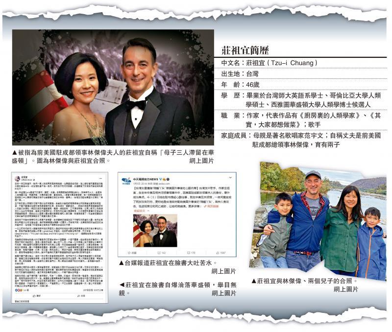 台灣發片歌手、作家莊祖宜,在去年中美互相關閉領事館事件中,因美國駐成都總領事夫人的身份,意外成為焦點。她日前在臉書稱,「一夜間搖身變成網民口中以美食和音樂做幌子從事顛覆任務的女特務、香蕉人、台灣政府配給美國外交官的『陪睡...[详细]