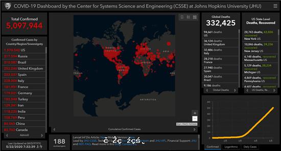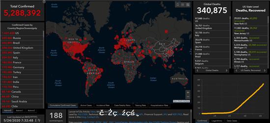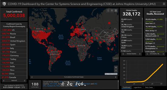 根據美國約翰霍普金斯大學今日(21日)下午更新的數字,新冠肺炎全球累計確診病例突破500萬宗。網站顯示,目前全球死亡人數為32.8萬。 [详细]
