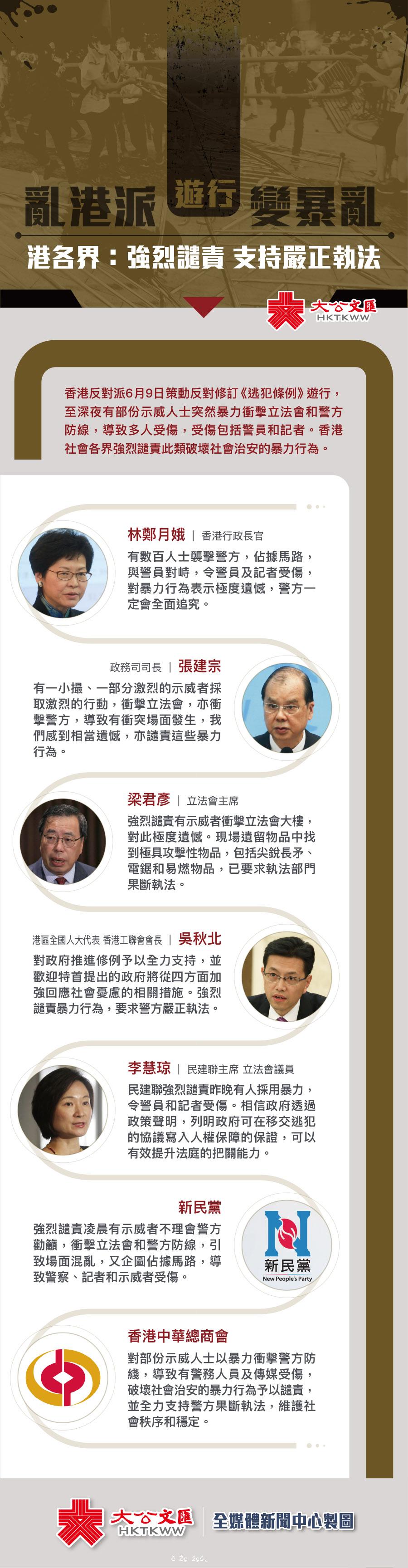 亂港派遊行變暴亂 港各界:強烈譴責 支持嚴正執法