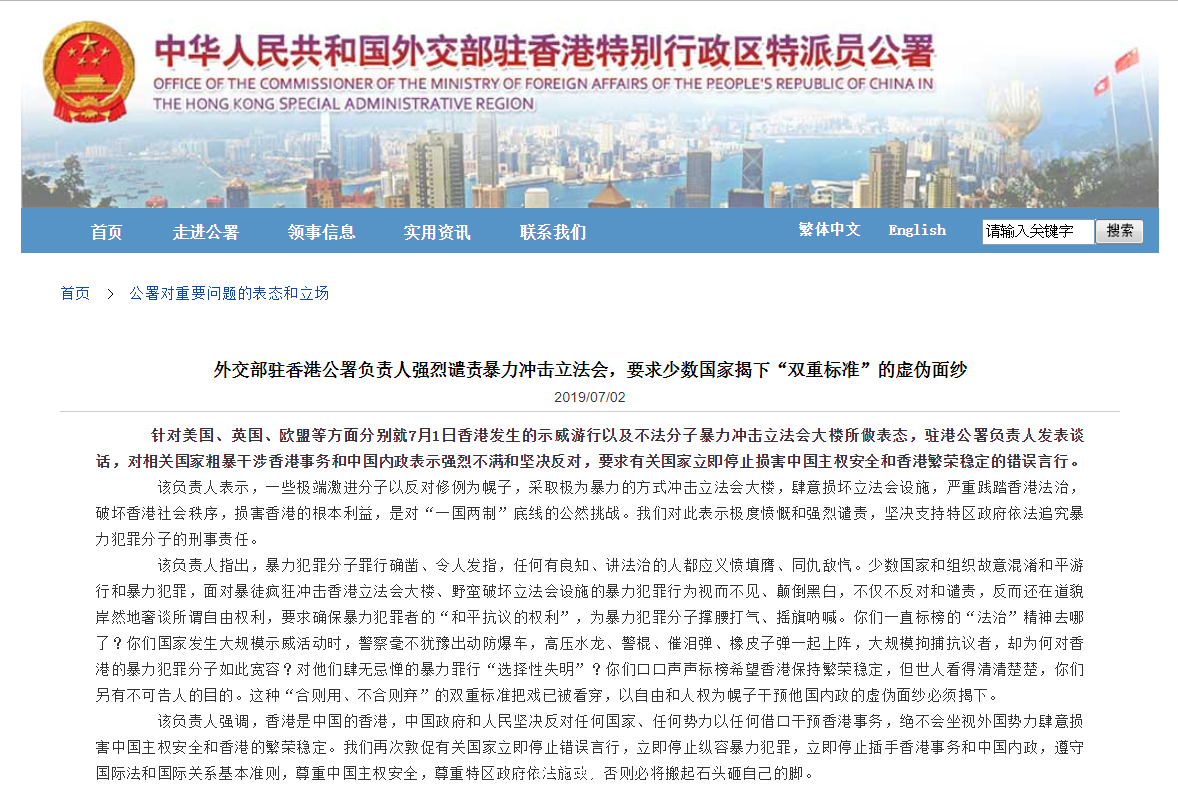 外交部駐港公署:強烈譴責暴力行為 英美等少數國家須揭下虛偽面紗