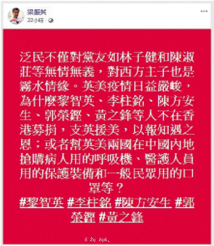 全國政協副主席梁振英10日深夜發文,斥責「泛民」政客無情無義,對自己友如林子健、陳淑莊等人深陷「困境」亦是無動於衷,對西方主子亦是霧水情緣。就反對派陳淑莊日前涉「犯聚」,有政界人士表示,作為公職人員更應該以身作則,以更高...[详细]
