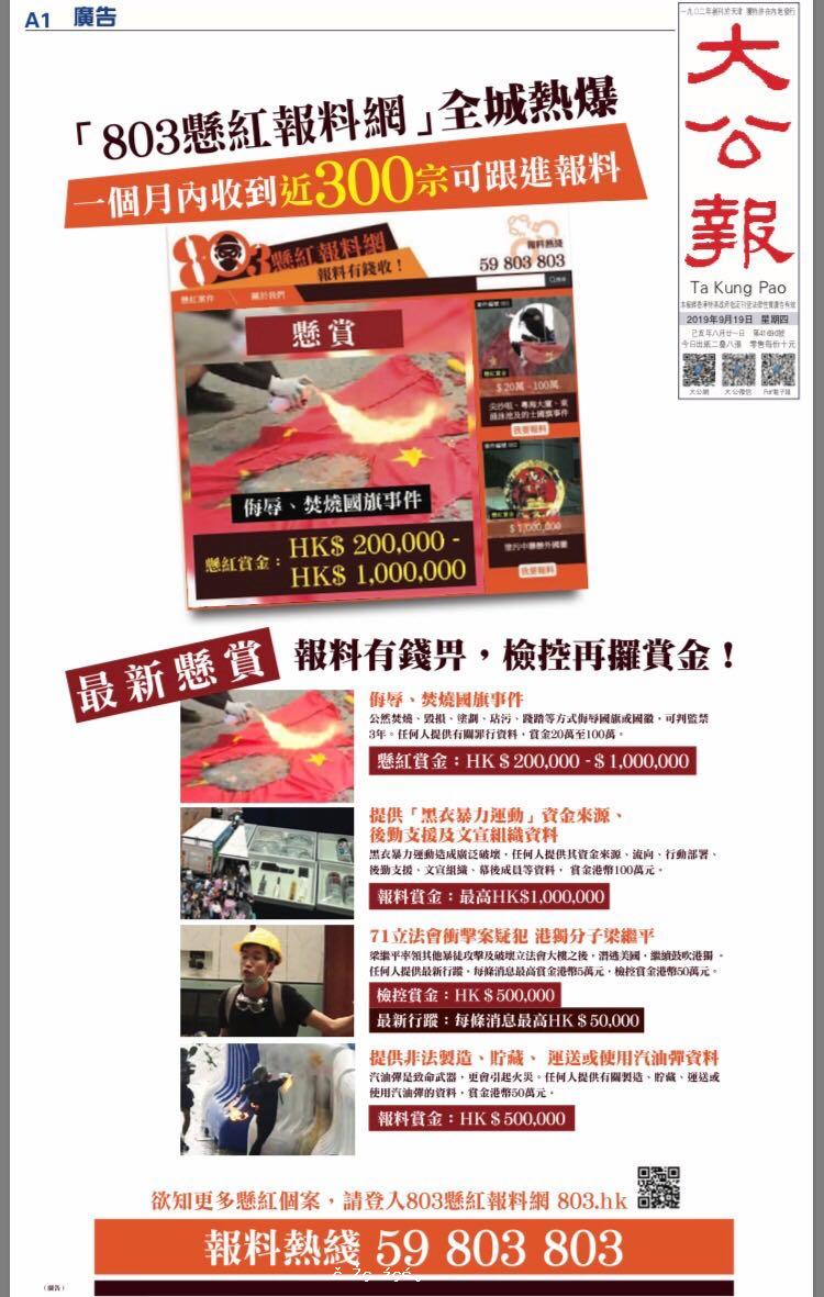 香港反修例騷亂持續逾三個月,暴力逐漸升級,行徑令人髮指。全力搜集暴徒違法行徑的「803懸紅爆料網」自開通一個月來,已經收到近300宗可跟進有價值爆料。「803懸紅爆料網」的正義之舉不僅令暴徒聞網喪膽,更有機會為執法部門提供更多更...[详细]