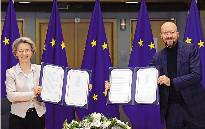 綜合路透社、《衛報》、美聯社報道:英國脫歐過渡期將在31日結束,英歐各方近日密鑼緊鼓正式簽署日前商定的「離婚協議書」。當地時間30日上午,歐盟委員會主席馮德萊恩和歐洲理事會主席米歇爾,在布魯塞爾正式簽署英歐就未來關係達成的協...[详细]