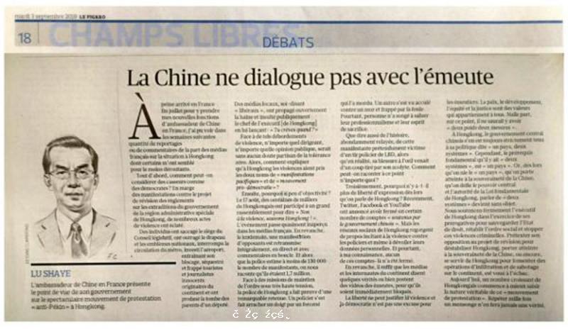 據法國《費加羅報》報道:中國駐法國大使盧沙野在法國主流媒體《費加羅報》發表署名文章,闡述中國政府對近期香港局勢的立場和態度。盧沙野認為,自由不是暴力的藉口,民主亦不是暴亂的免罪符。 [详细]