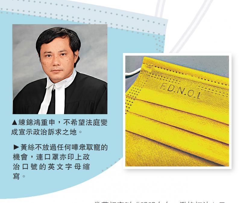 區域法院周一審理有市民去年九月於淘大商場遭暴徒行私刑案期間,法官練錦鴻發現一名律師和兩名旁聽者,在庭上戴上深黃色、印有「FDNOL」(所謂五大訴求、缺一不可)五個英文字母縮寫的口罩,指示他們離開法庭,但事後被部分市民誤解為無理...[详细]