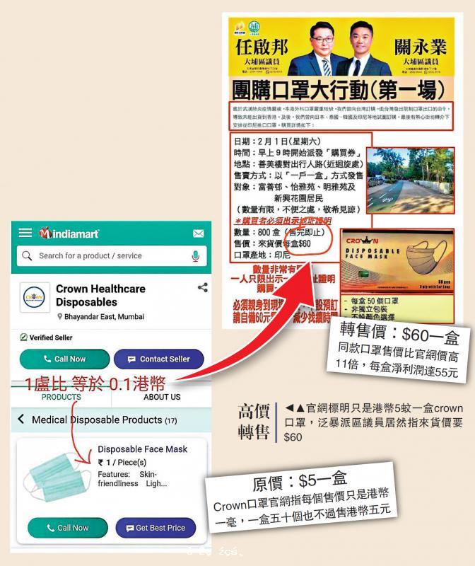 泛暴派平時開口埋口講所謂「公義」,扮曬正義,但原來患難見「真情」。 同為大埔區議員的新民主同盟關永業和任啟邦,在宣傳單張上聲稱昨日向街坊出售來自「印尼」公司「CROWN」製造的口罩,並註明以來貨價每盒60港元的價格出售,每盒50個...[详细]