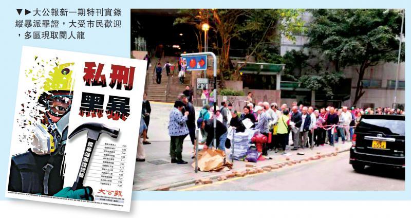 大公報特刊揭縱暴派罪證 市民排長龍爭閱《大公報》昨日推出最新特刊《私刑黑暴 縱暴派罪證實錄》,以詳實的資料、豐富的圖片,真實還原五個月來在縱暴派、暴徒的推波助瀾下,暴亂逐步升級的過程,披露暴徒衝擊香港法治的真相。 [详细] 2019-11-21 16:16 分类:反港獨
