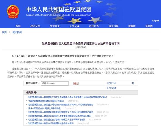 中國駐歐盟使團:反對歐盟對香港警方依法履職說三道四