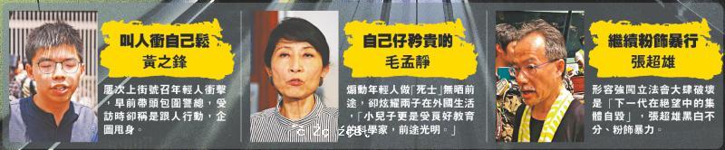 從違法「佔中」到旺角暴亂,反對派充當暴徒幫兇,不斷美化犯罪、包庇暴力,更視此為政治本錢,致令連串違法暴力事件升級。對青年人自殺、「死士」心態,以及不顧一切暴力衝擊,這群幫兇竟吹捧成「下一代在絕望中的集體自毀」,為選票不惜...[详细]