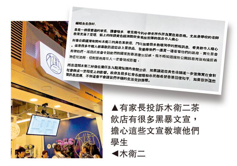 有家長致函大公報編輯,投訴銅鑼灣木衛二茶飲店有很多黑暴文宣。家長說,很多學生喜歡到這些店買飲品,擔心這些文宣教壞他們。而且這家茶飲店會在灣仔和九龍灣開分店,如果讓這些黃色店舖進一步宣傳會對社會造成不好的影響。[详细]