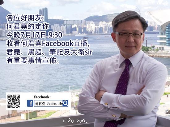 現屆立法會議員何君堯今日(17日)在個人社交網頁宣布,今晚9時30分將有重要事項宣布,相約社會各界收看實況直播,預料何君堯將宣布參加下屆立法會選舉。[详细]