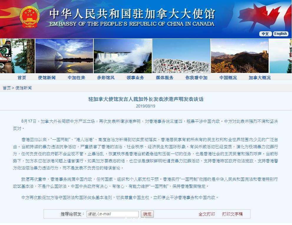 中國駐加拿大使館周一(19日)在官方網站發文,批評加國外長在上周六(17日)罔顧中方嚴正立場,再次發表所謂涉港聲明,對香港事務說三道四,粗暴干涉中國內政,中方對此表示強烈不滿和堅決反對,並再次敦促加方恪守國際法和國際關係基...[详细]