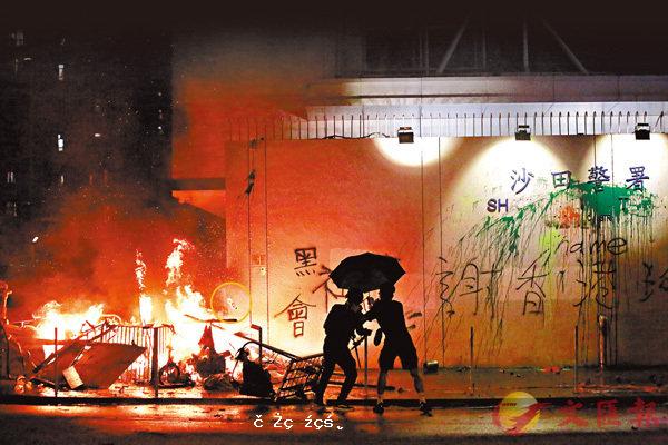 ■沙田警署外火焰高約3米,暴徒還不斷向火堆投擲助燃劑(圖圈)。 非法集結日繼夜 煙火淚彈遍全城 警拘至少82人[详细]