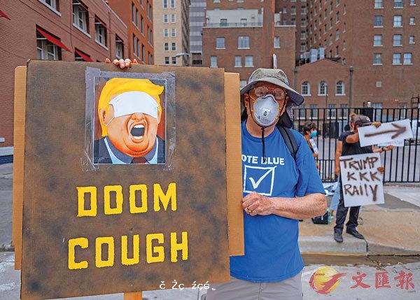 ■ 反對特朗普人士在其集會外抗議示威,展示寫有「笨蛋」的牌子。法新社 號召縮減規模 稱病毒Kung Flu再抹黑中國[详细]