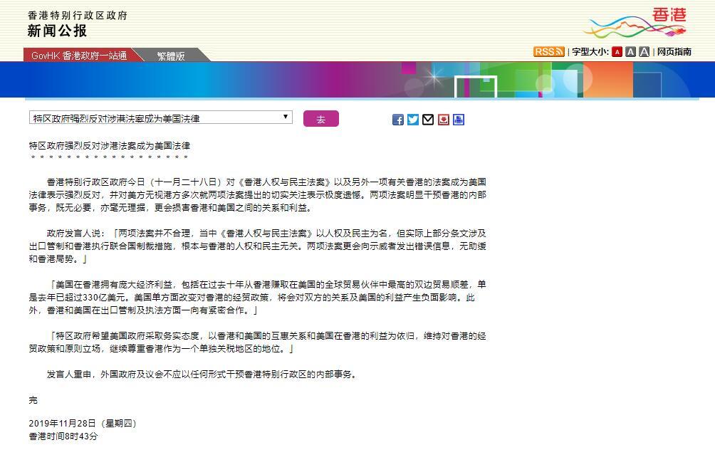 白宮當地時間周三發表聲明稱,美國總統特朗普已簽署「香港人權與民主法案」。對此,特區政府於北京時間28日發佈新聞公報,對「香港人權與民主法案」以及另外一項有關香港的法案成為美國法律表示強烈反對,並對美方無[详细]