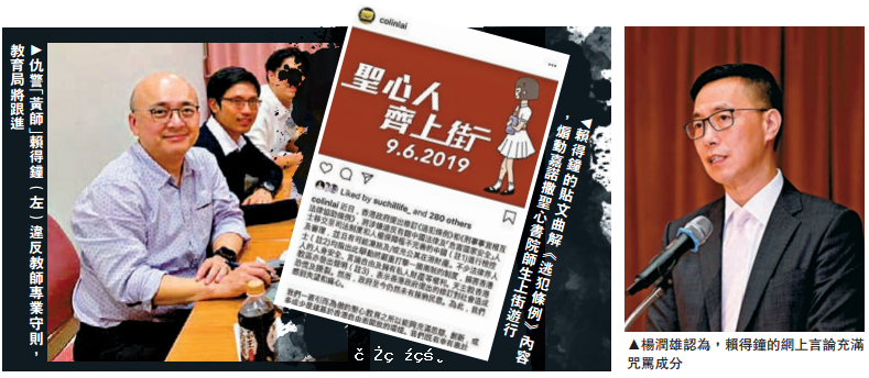 仇警「黃師」賴得鐘再被揭早在五月底已在社交網站煽動他所任教的學校學生上街,貼文內容更惡意扭曲《逃犯條例》內容,有誤導之嫌。教育局局長楊潤雄昨日強調,「對專業老師的要求是他們不可以在課堂上嘗試把自己的政治看法和觀念灌輸予學...[详细]