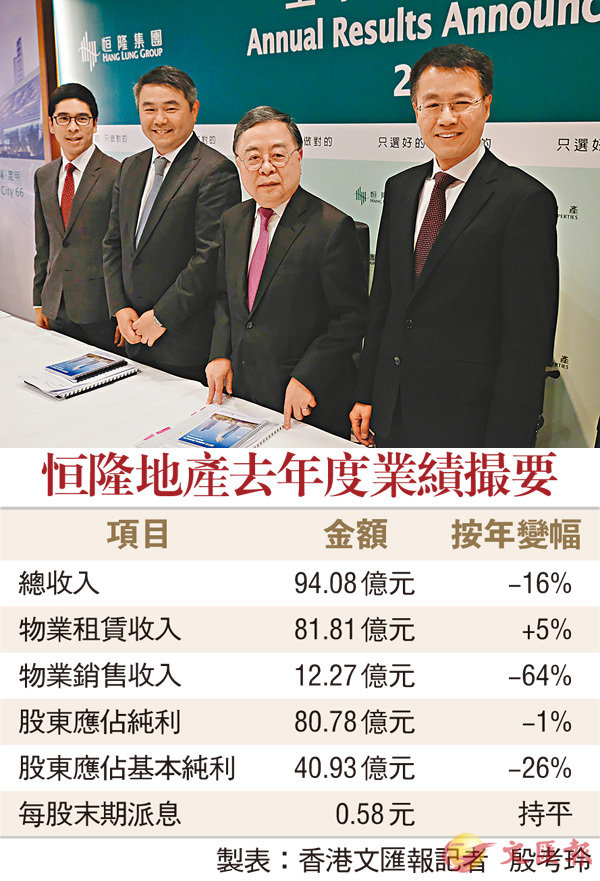■陳啟宗(右二)稱,集團一直有在港物色收購項目。左一為陳文博,左二為盧韋柏。 梁祖彝 攝恒隆地產(0101)昨公佈去年度業績,截至去年底股東應佔純利為80.78億元,按年下跌1%;若不計物業重估收益,股東應佔基本純利為[详细]