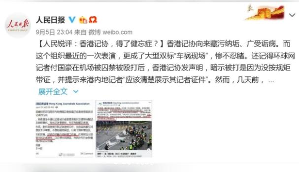 內地《人民日報》在官方微博,發表批評香港記者協會的評論文章。文章批評香港記協拋出荒唐論調,又形容從未見過如此毫不知恥的「健忘」。 [详细]