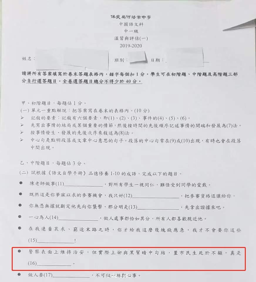 中學語文題含污衊警察 港生家長促請校長公開解釋
